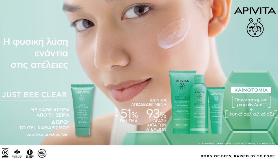 Με κάθε αγορά από τη σειρά Apivita Just Bee Clear, ΔΩΡΟ gel καθαρισμού 50ml!