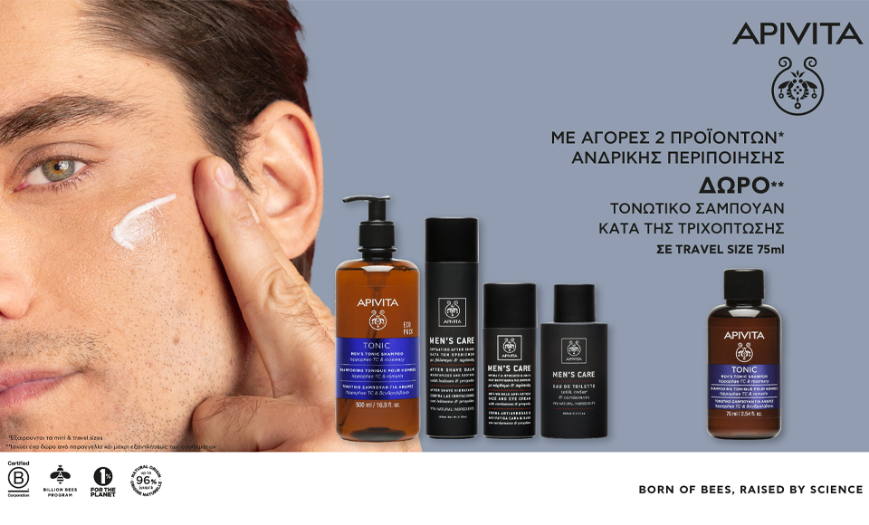 Με αγορές 2 προϊόντων ανδρικής περιποίησης Apivita, ΔΩΡΟ τονωτικό σαμπουάν 75ml!
